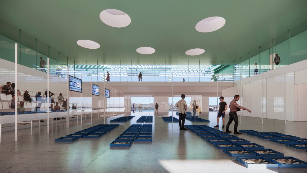 Se diseña el edificio en base a dicha estrategia, un edificio con un basamento, rotundo y resistente, destinado a la actividad profesional, una caja funcional que contiene un uso de tipo industrial. Sobre dicho basamento, un edificio flexible, ligero, icónico y reconocible, que albergará un uso dotacional y administrativo, y desde el que contemplar la actividad pesquera y el paisaje desde su espectacular terraza mirador.