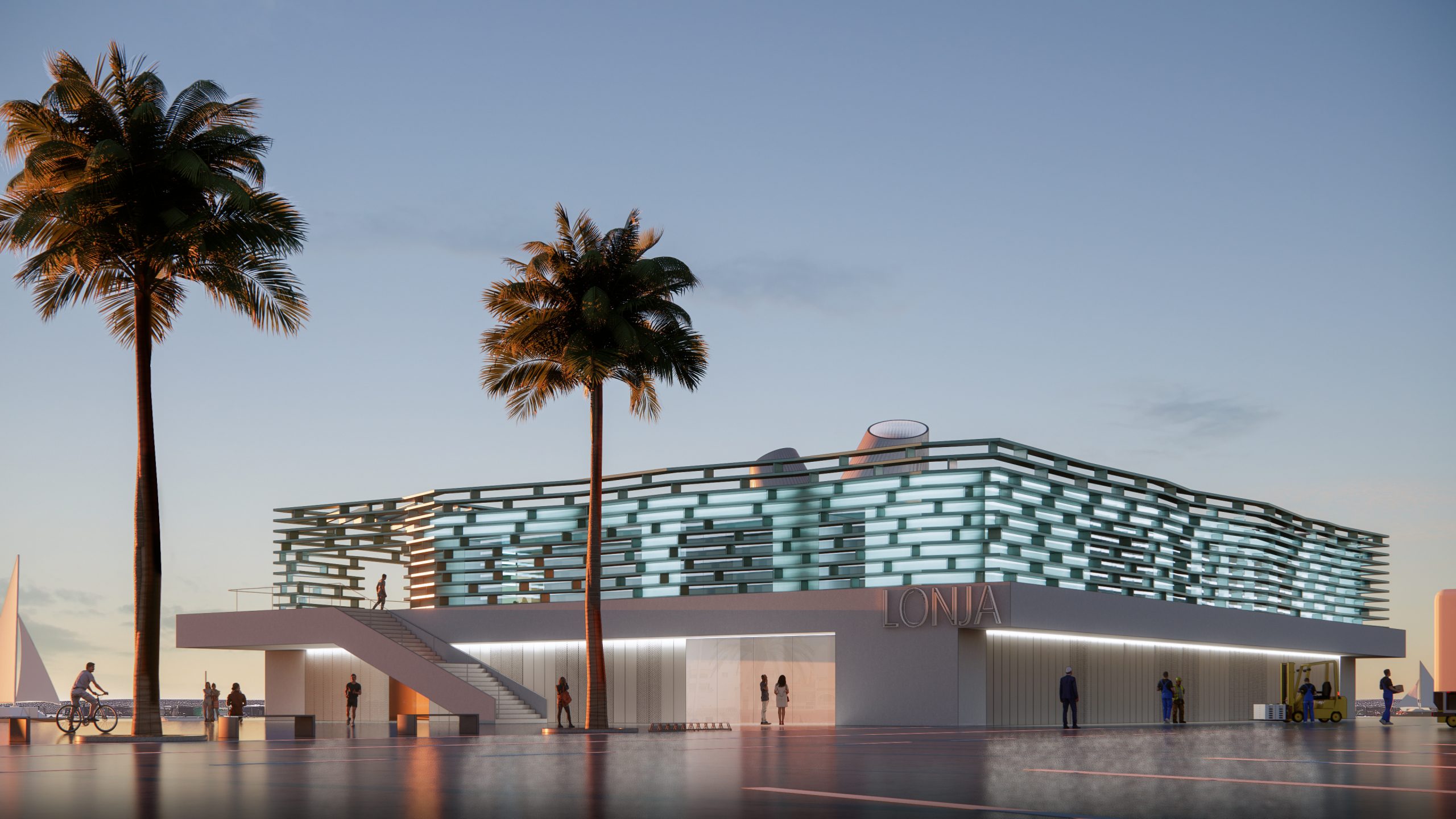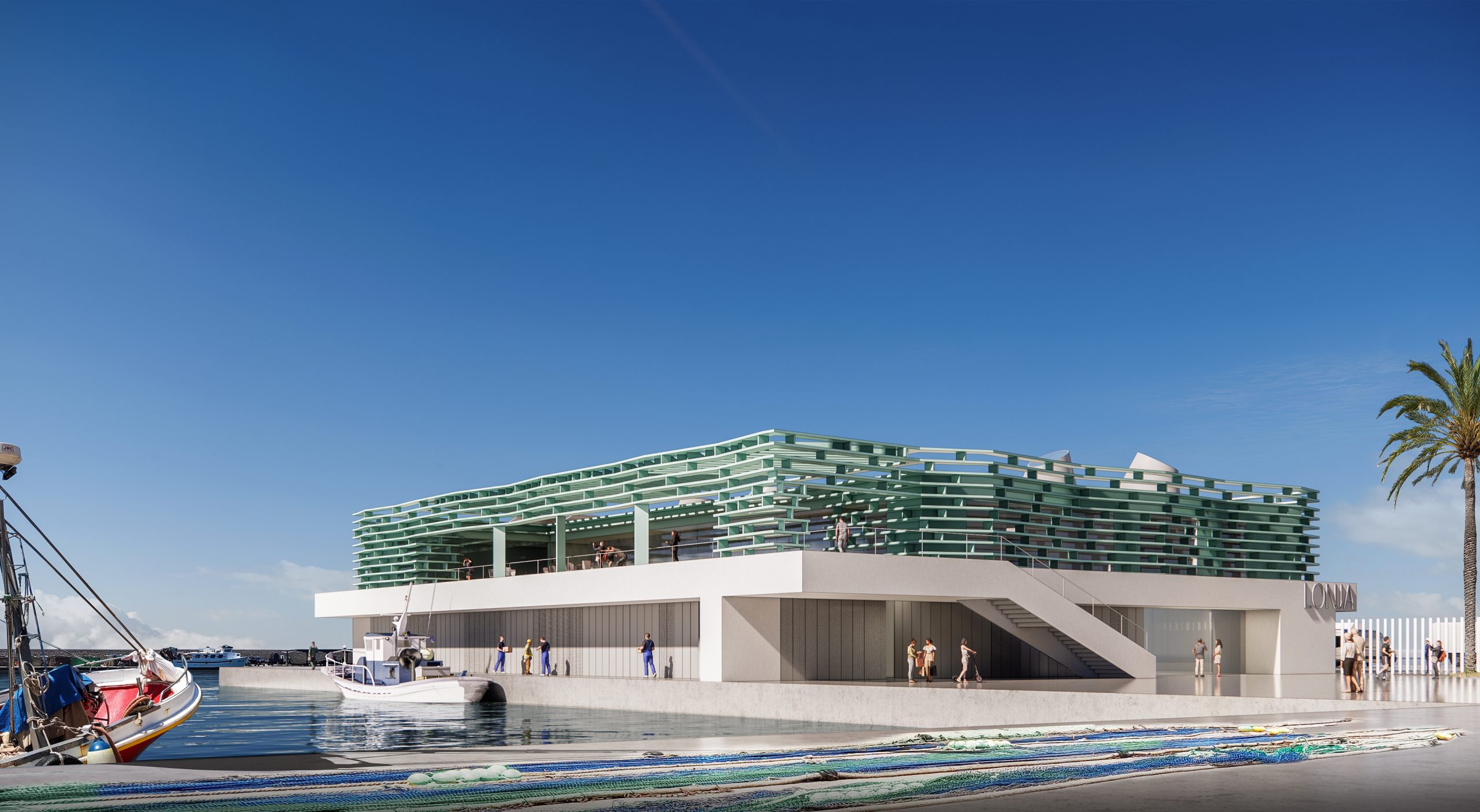 El proyecto para La lonja en el puerto de Caleta de Vélez es el resultado de una dualidad: por un lado se posiciona de forma que establece un límite y acota y define la actividad y el área pesquera, por otro lado ofrece la posibilidad de ser accesible para visitantes, enriqueciendo la relación puerto ciudad, y creando una plaza de acceso pública como remate al paseo marítimo.