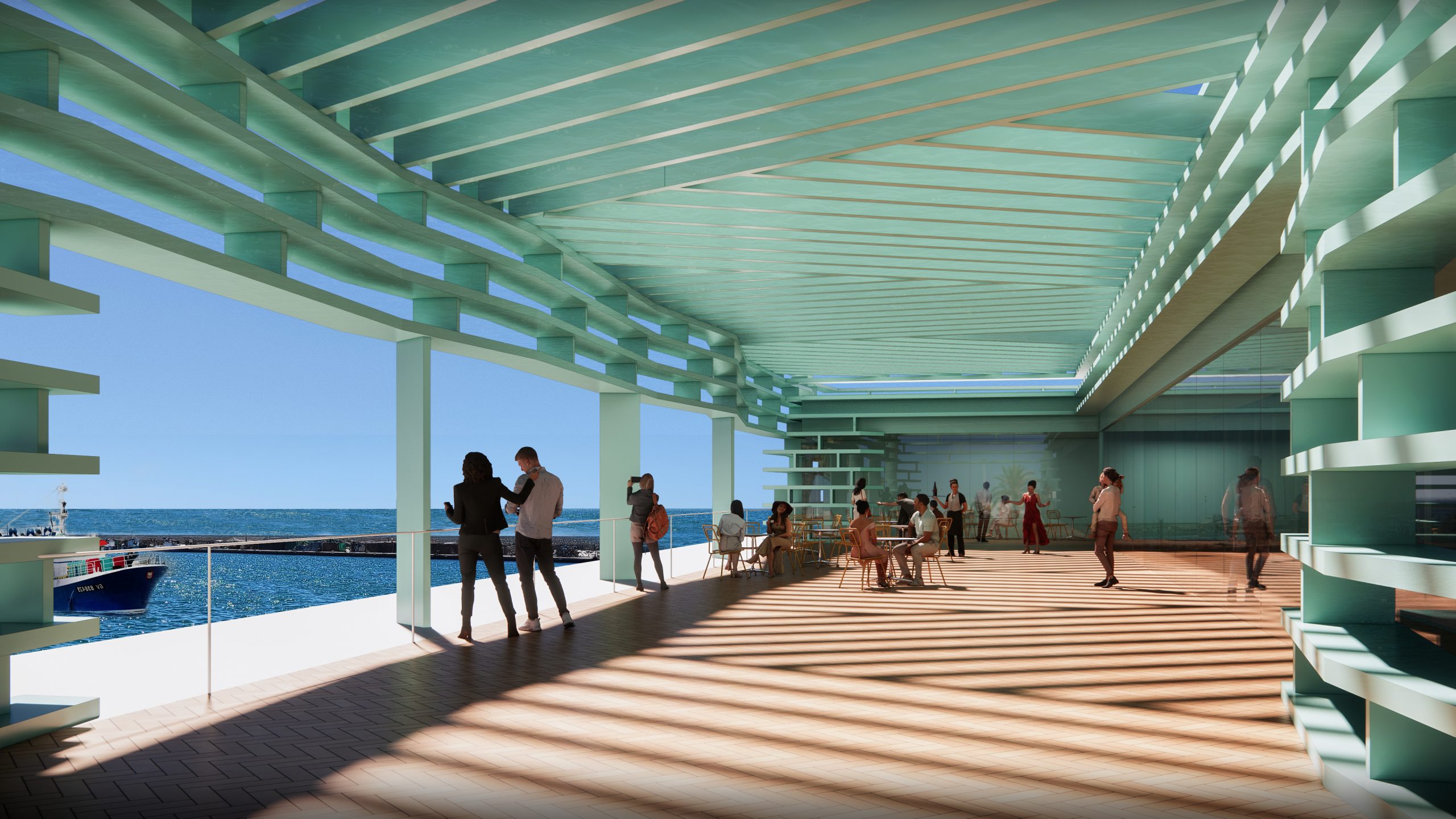 Se diseña el edificio en base a dicha estrategia, un edificio con un basamento, rotundo y resistente, destinado a la actividad profesional, una caja funcional que contiene un uso de tipo industrial. Sobre dicho basamento, un edificio flexible, ligero, icónico y reconocible, que albergará un uso dotacional y administrativo, y desde el que contemplar la actividad pesquera y el paisaje desde su espectacular terraza mirador.