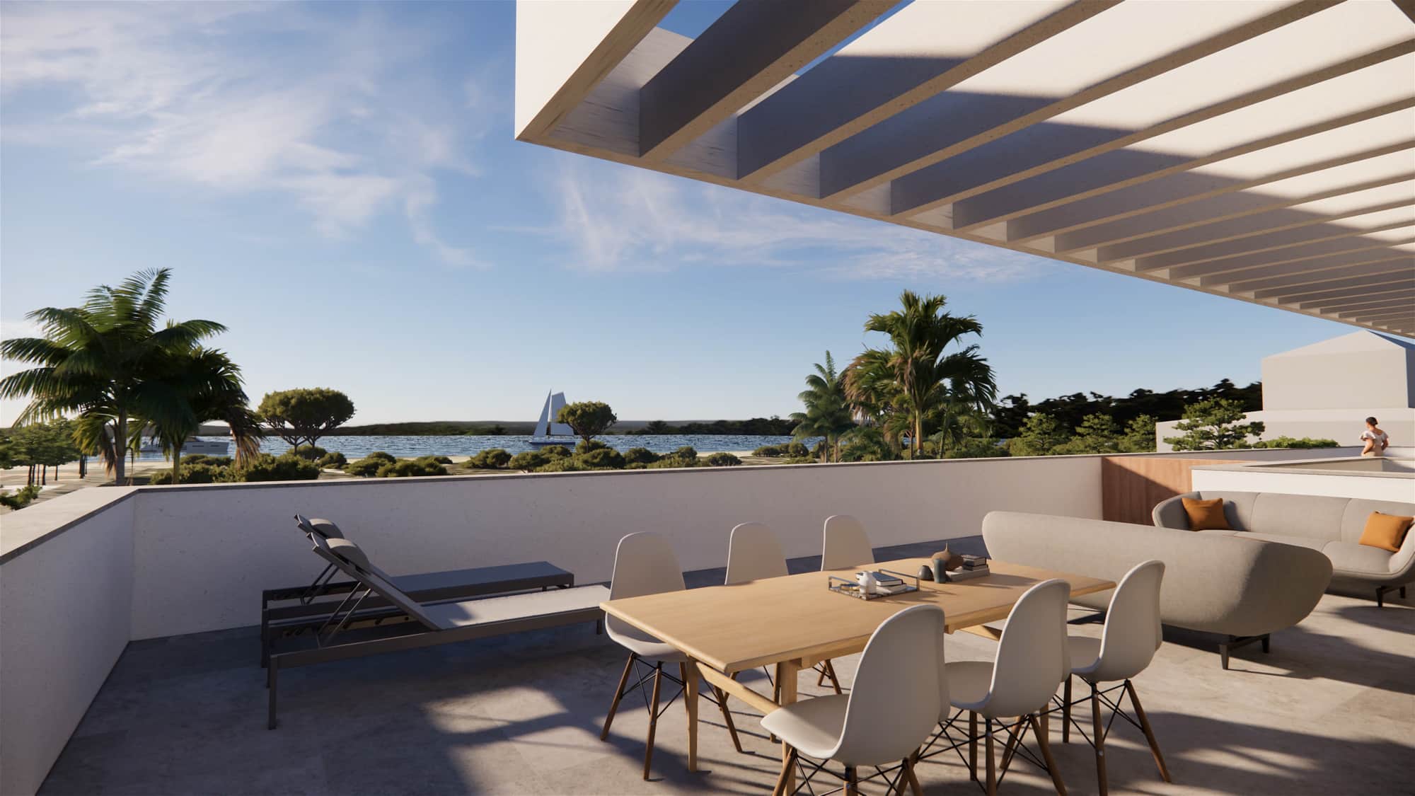 El volumen edificado se sitúa al norte de la parcela, generando un gran vacío al sur de la misma que alberga las zonas de ocio comunes del edificio, muy próximo a la playa. Frente a la tipología predominante en la zona, que consiste en viviendas unifamiliares adosadas, la morfología y parámetros urbanísticos de la parcela permitían la distribución de las viviendas en un bloque plurifamiliar, permitiendo así obtener viviendas amplias y una gran zona común a todas las viviendas en la zona más próxima a la playa.
